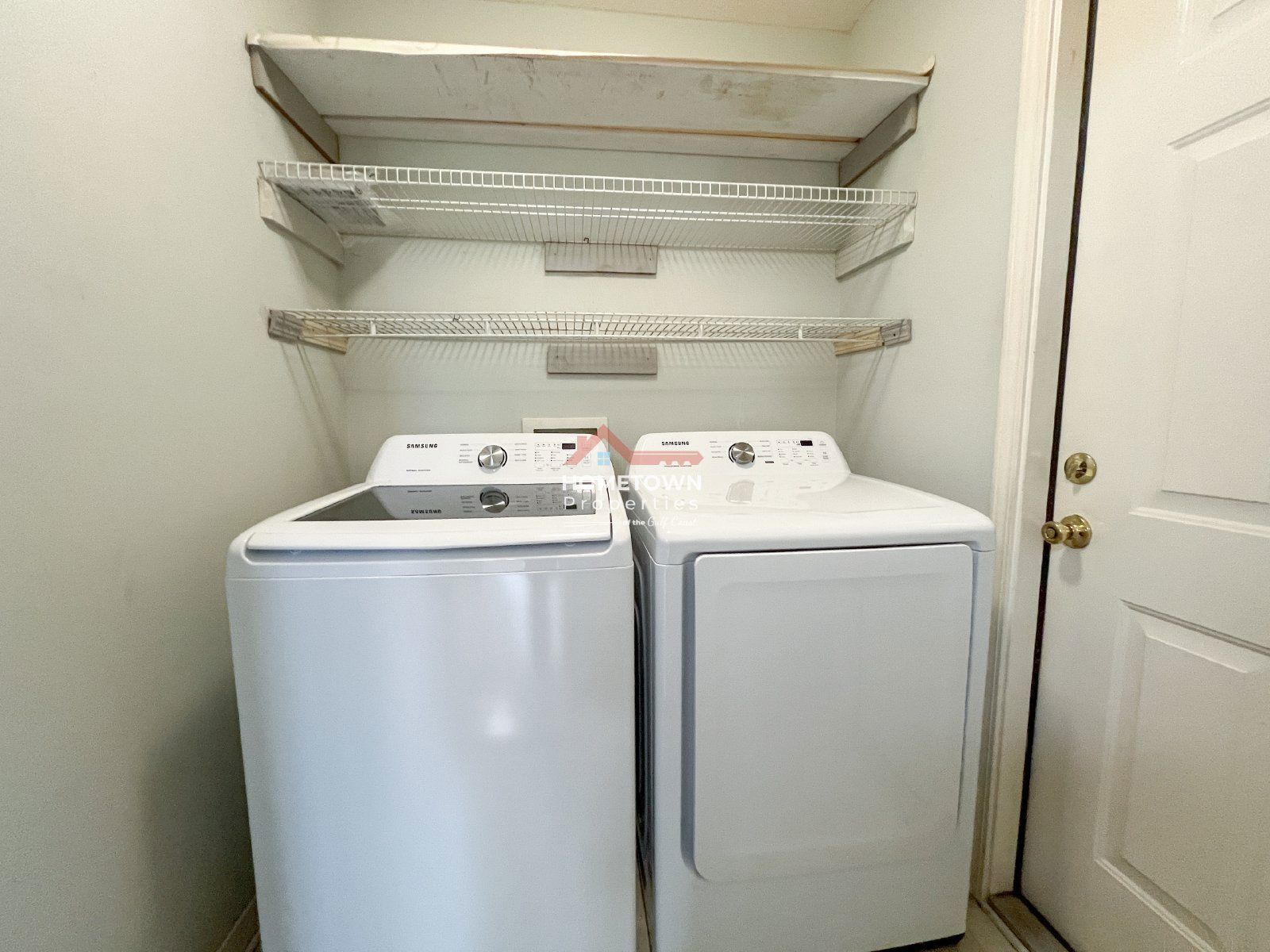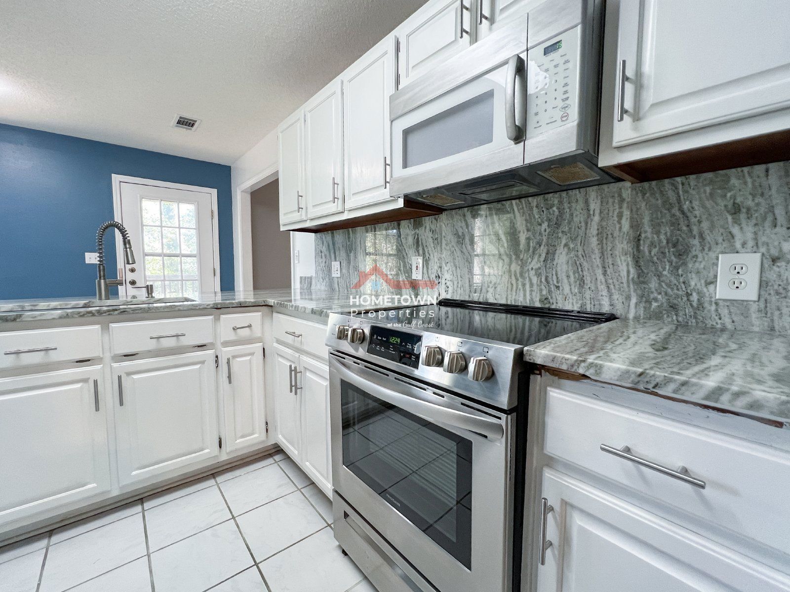 The kitchen has new countertops, modern appliances, a microwave, and a large pantry. The laundry room, with a washer and dryer included, is off the kitchen and has access to the two-car garage.
