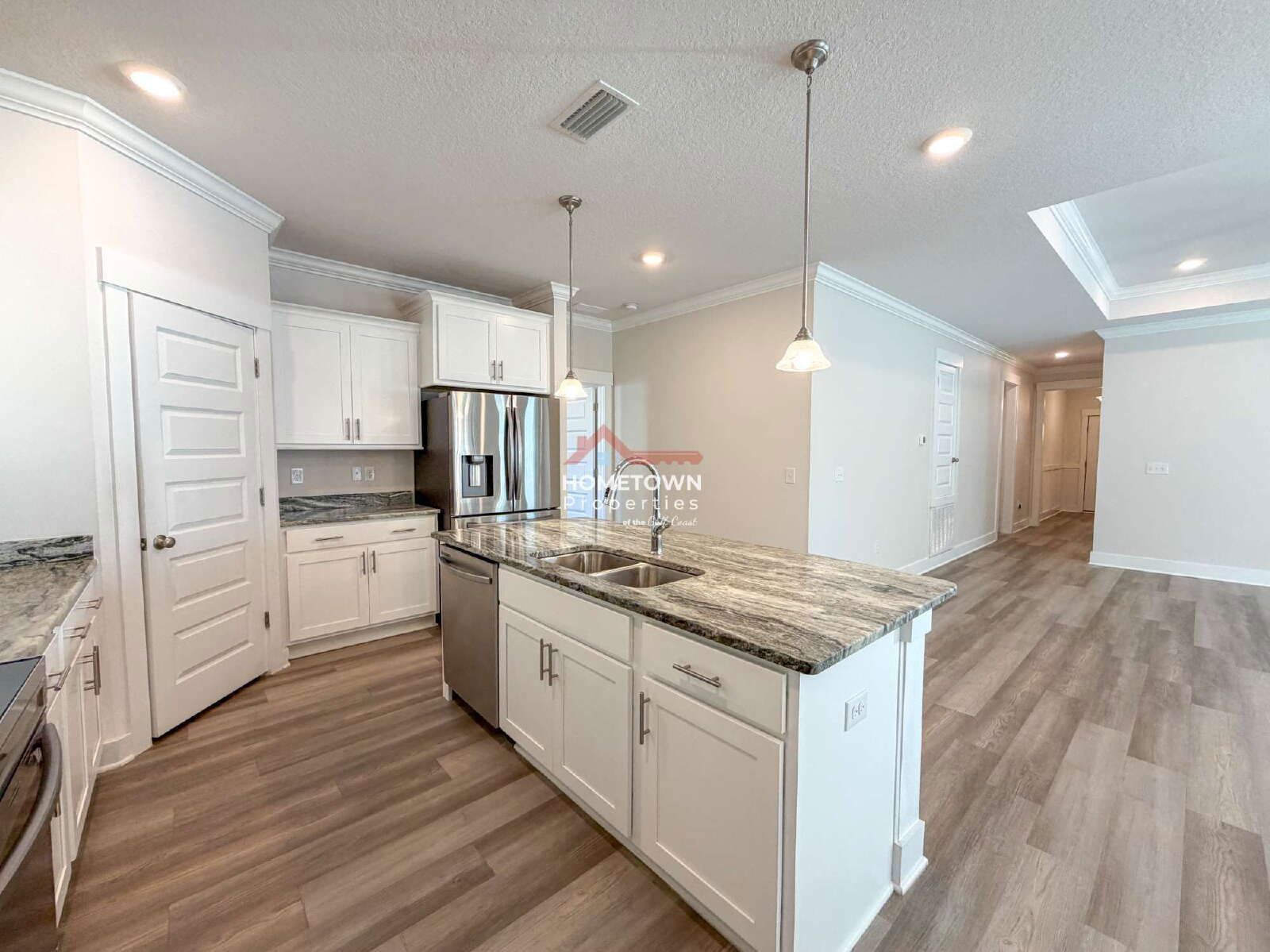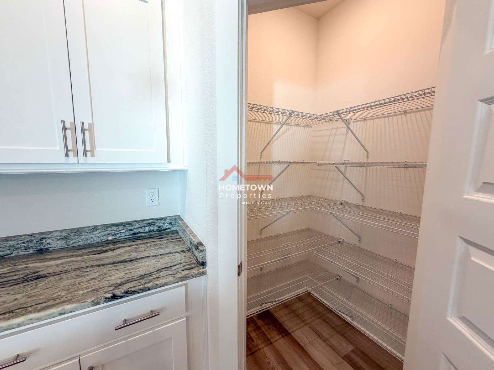 The kitchen has an island with granite countertops, stainless steel appliances, and a large pantry.