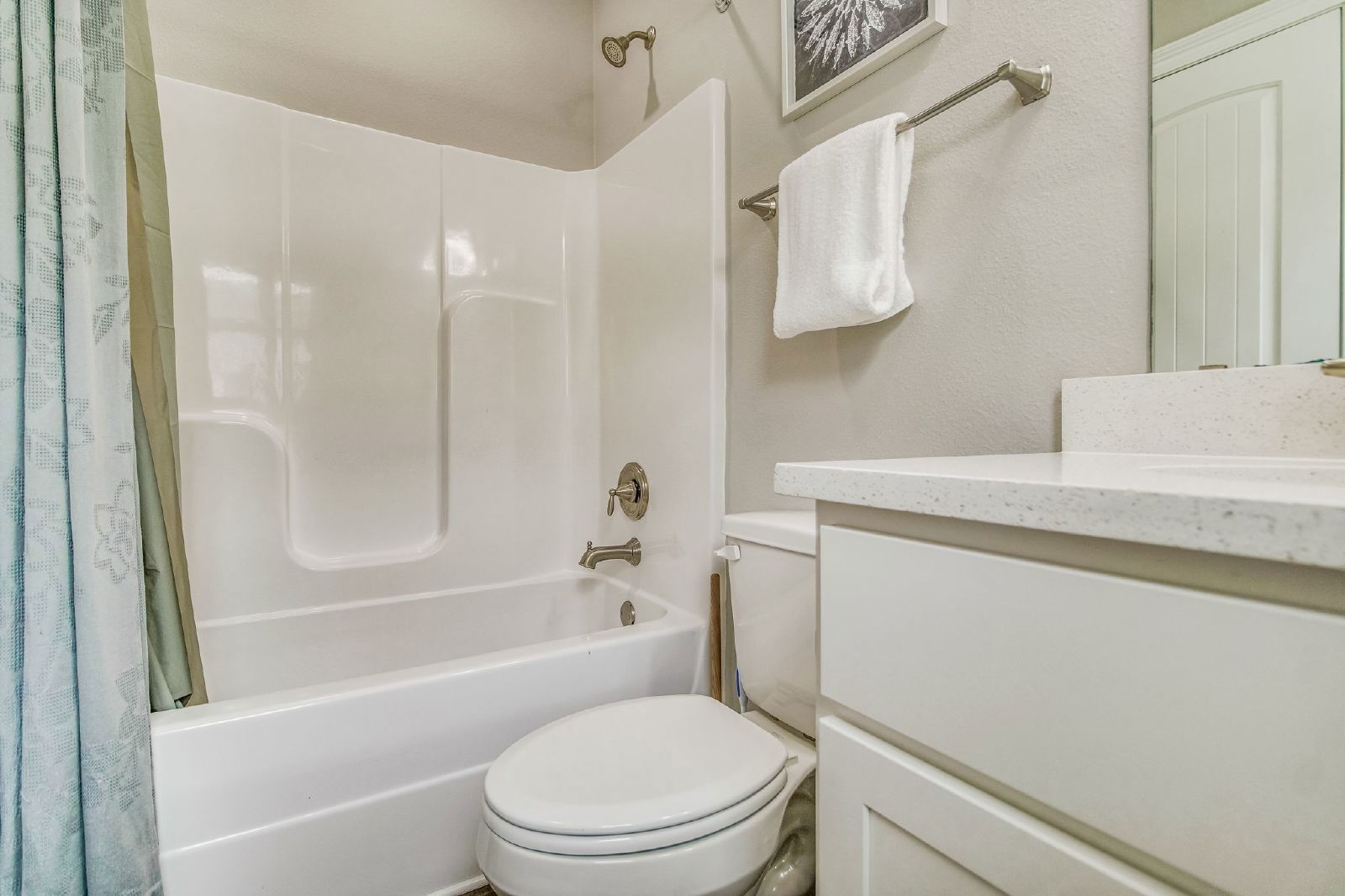 Open floorplan and luxury vinyl plank flooring throughout. The kitchen/dining combo features shaker-style cabinetry, quartz countertops, and stainless steel appliances. The upstairs primary bedroom has a private balcony and an ensuite bathroom with a walk-in shower. The second bedroom upstairs has a bathroom with a shower/tub combo. The washer and dryer are located on the second floor.