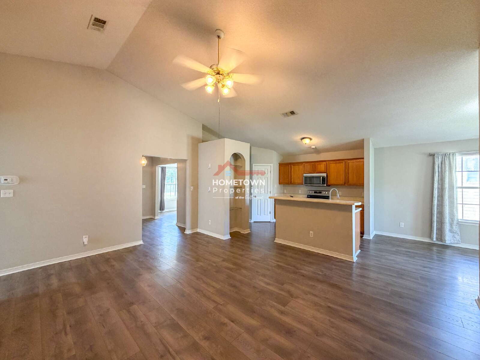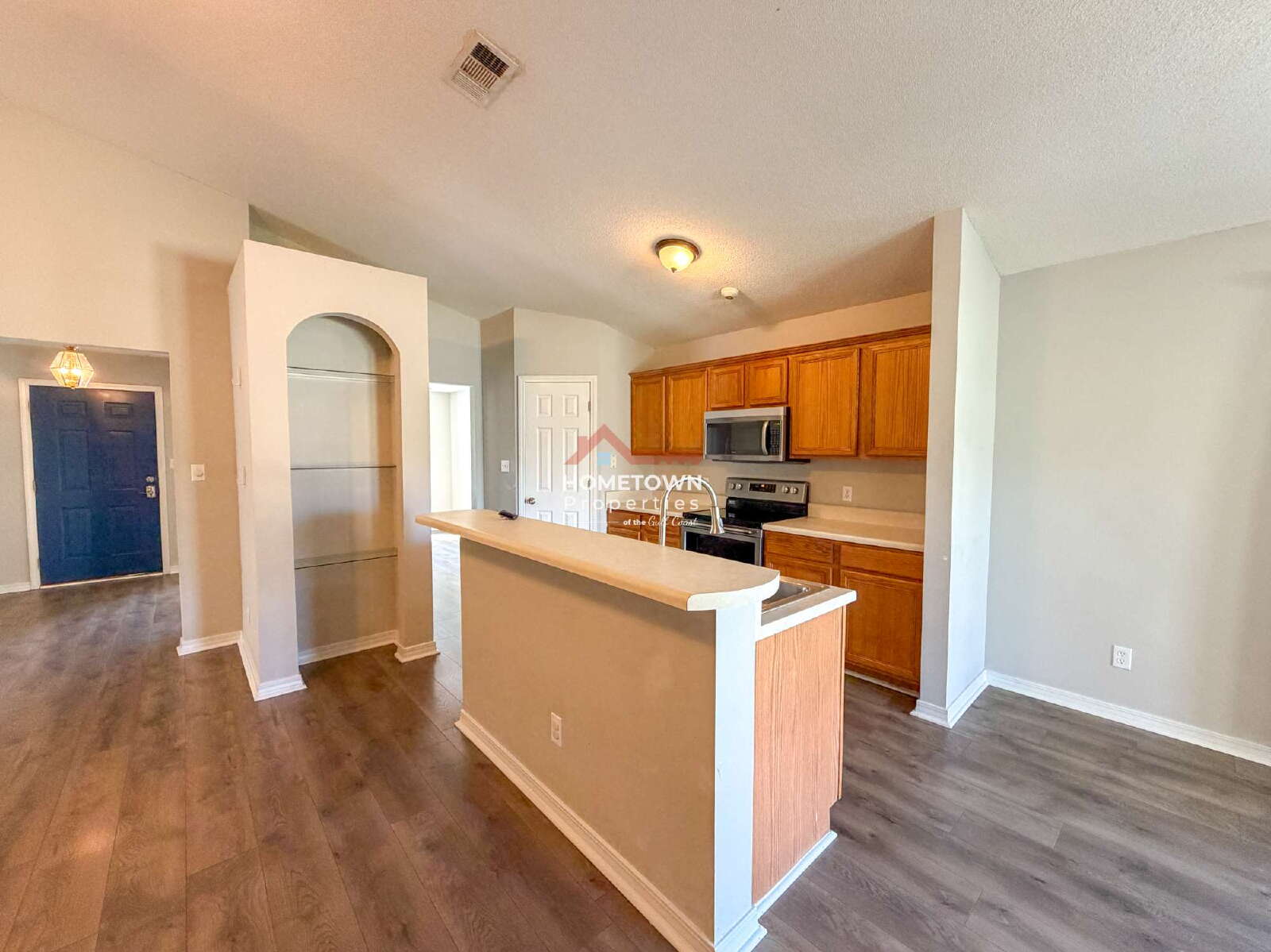 This home features luxury vinyl plank flooring throughout. The kitchen has an over-the-range microwave, electric stove/oven, refrigerator, pantry, dishwasher, and double sink.