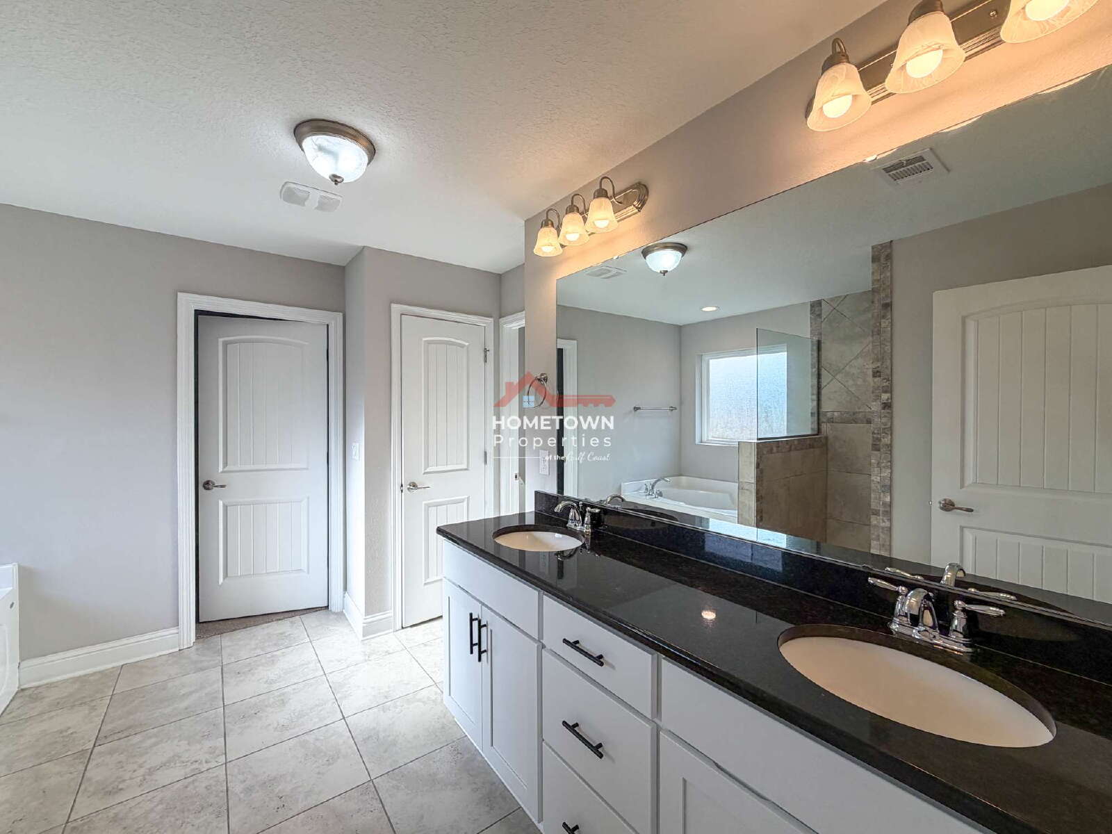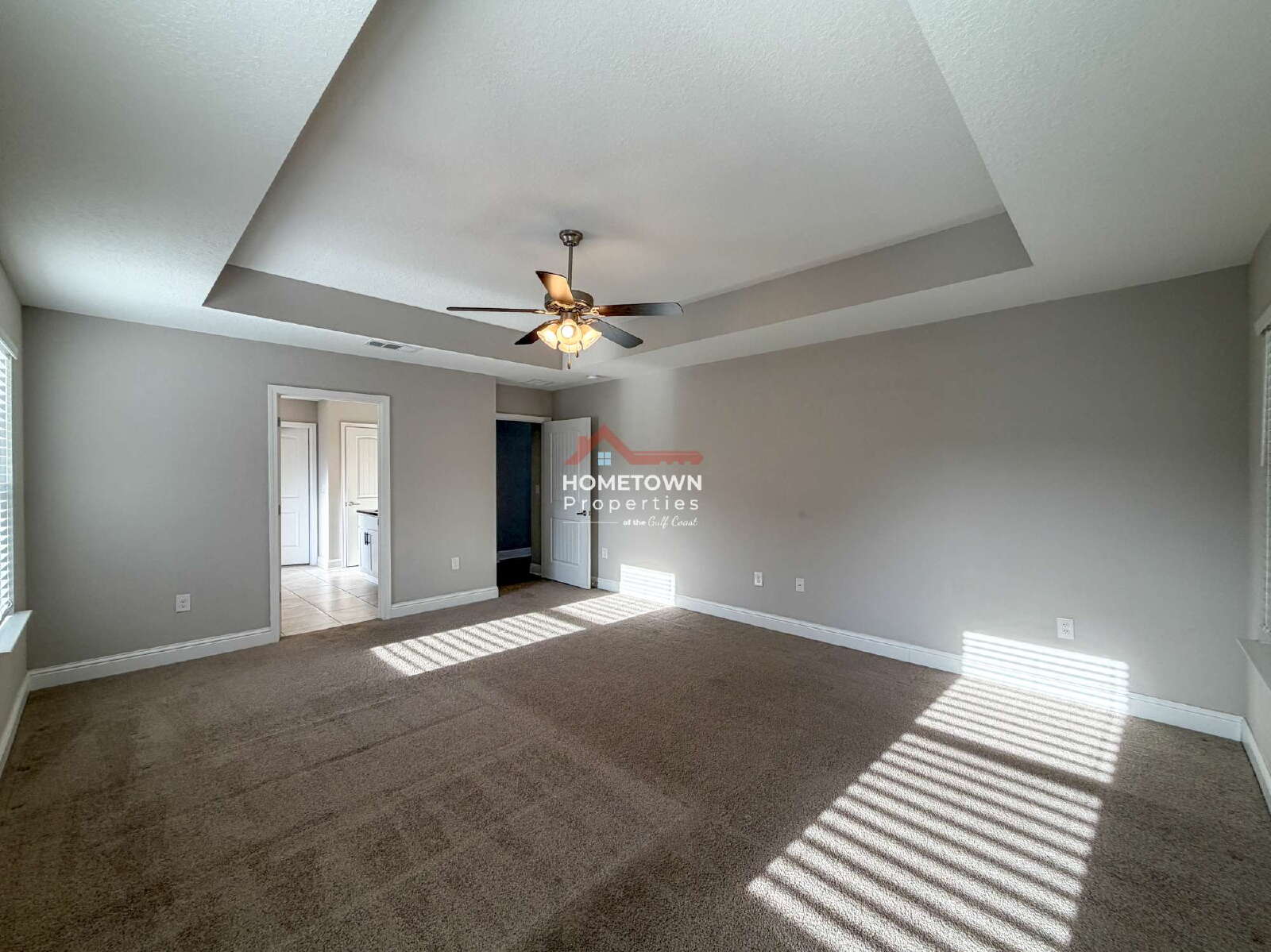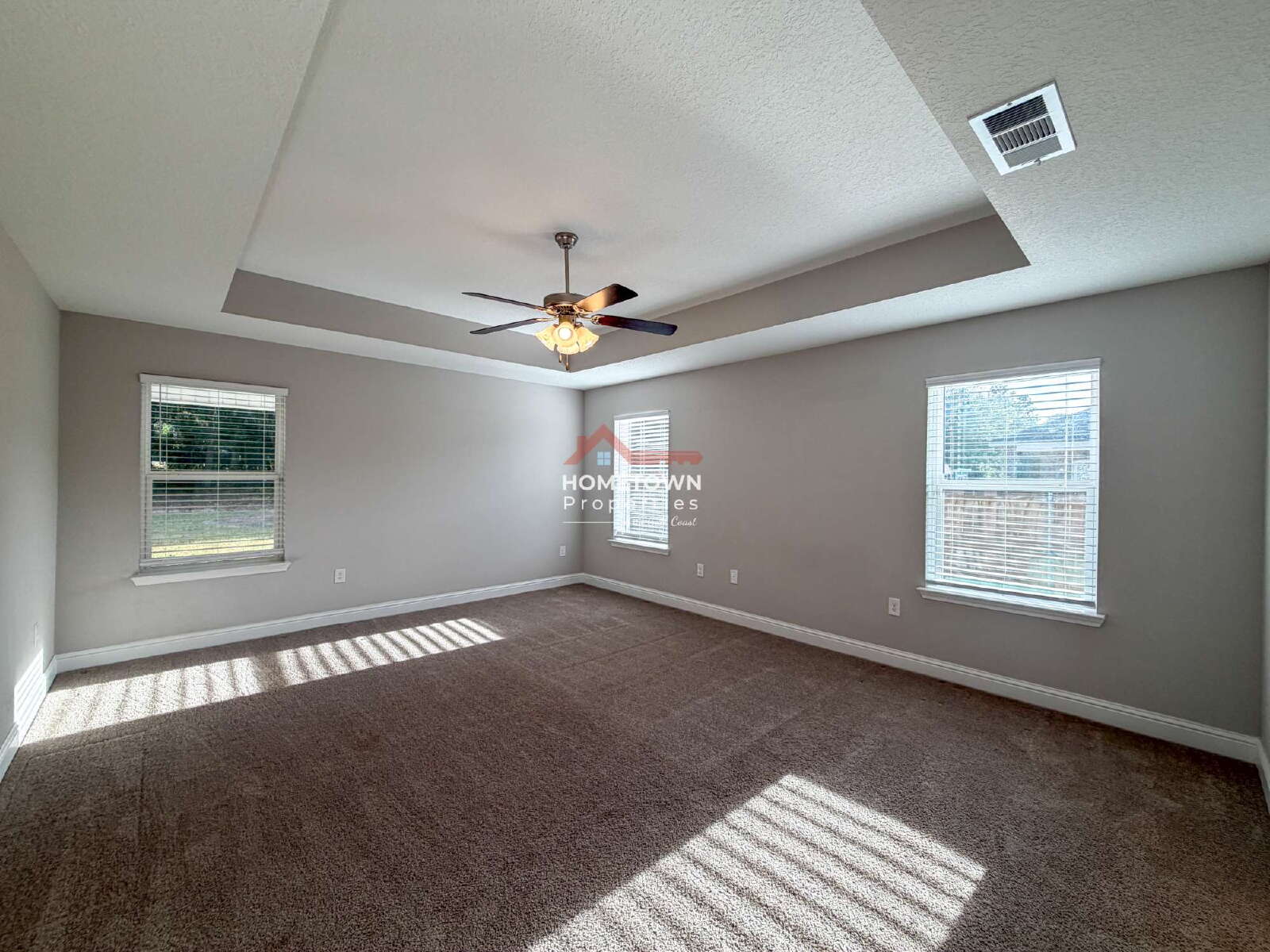 Four-bedroom, two-and-a-half-bathroom long-term rental on a spacious lot and two-car garage. The kitchen features stainless steel appliances and an expansive kitchen island. Double sink, refrigerator, electric stove, and over-the-range microwave, dishwasher, and pantry. Open-concept dining room, breakfast nook, and living room. The primary bedroom has a tray ceiling, carpet, and an ensuite bathroom with a double vanity, a large shower, a garden tub, and a huge closet that goes into the laundry room.