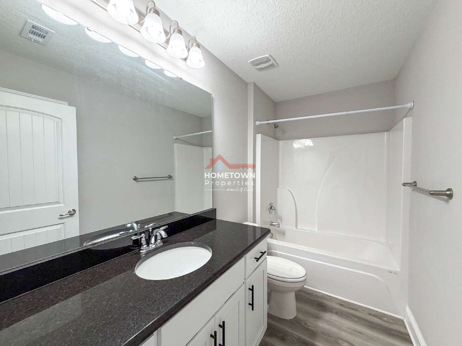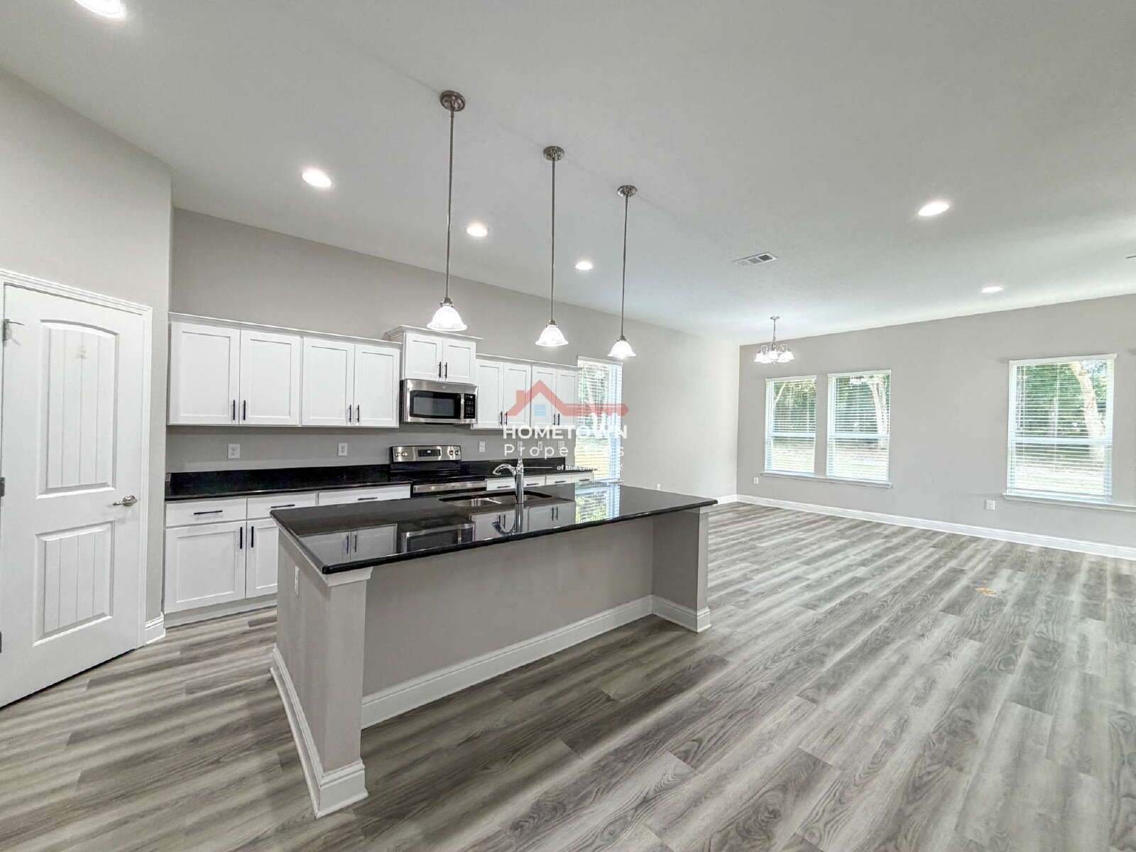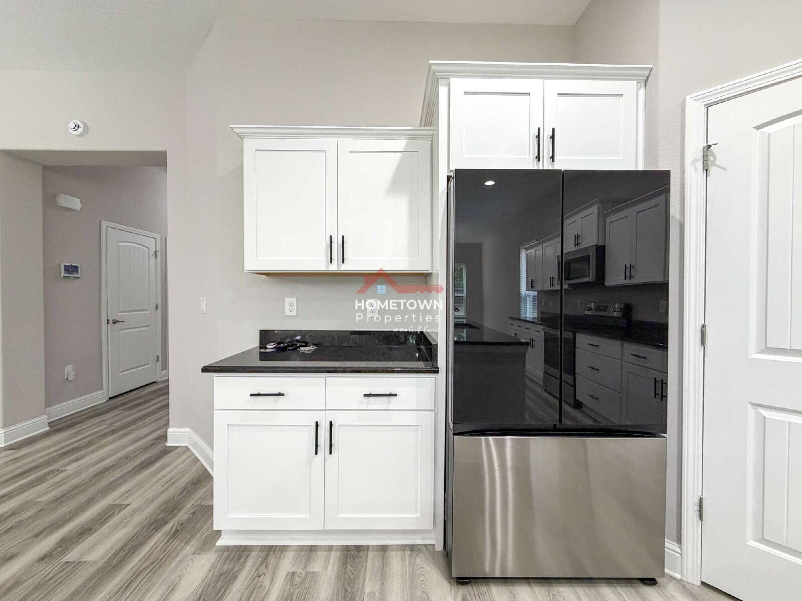 Four-bedroom, two-and-a-half-bathroom long-term rental on a spacious lot and two-car garage. The kitchen features stainless steel appliances and an expansive kitchen island. Double sink, refrigerator, electric stove, and over-the-range microwave, dishwasher, and pantry. Open-concept dining room, breakfast nook, and living room. The primary bedroom has a tray ceiling, carpet, and an ensuite bathroom with a double vanity, a large shower, a garden tub, and a huge closet that goes into the laundry room.