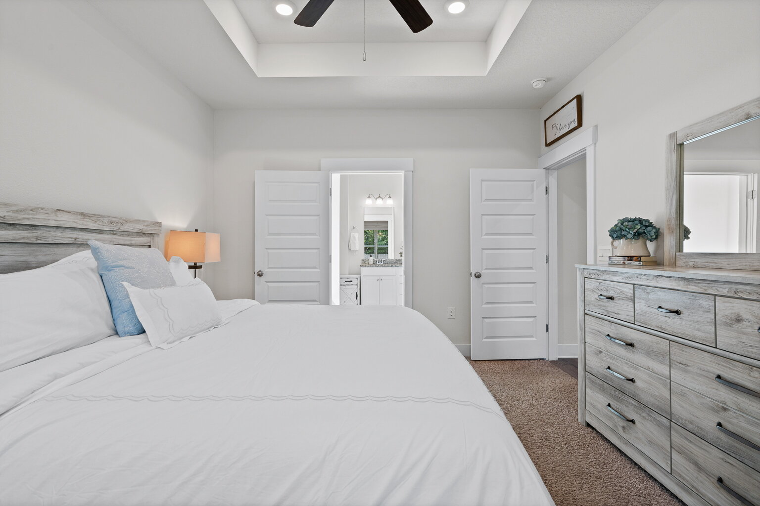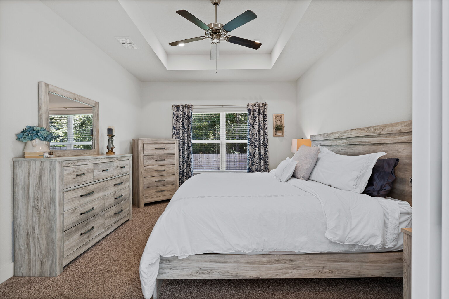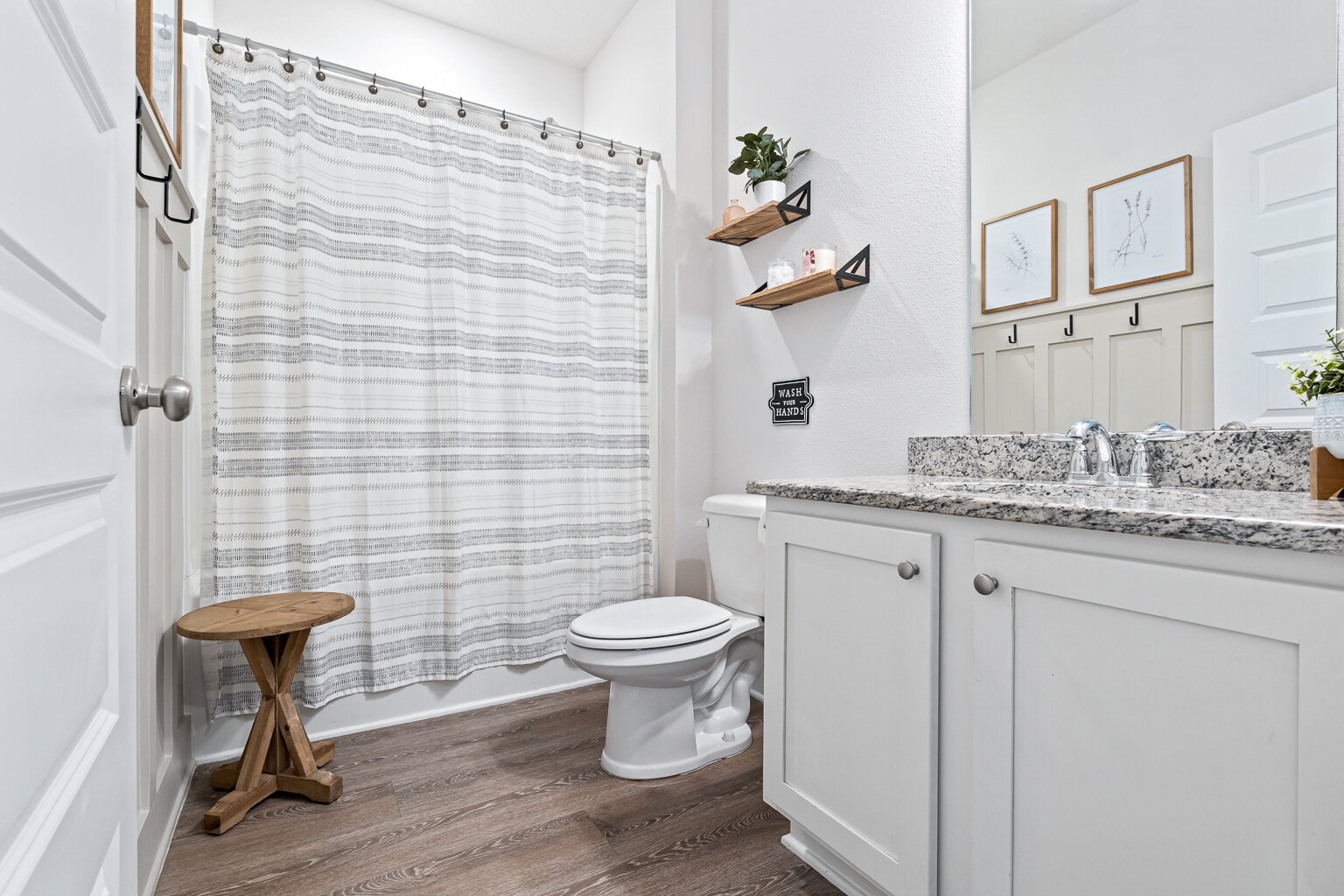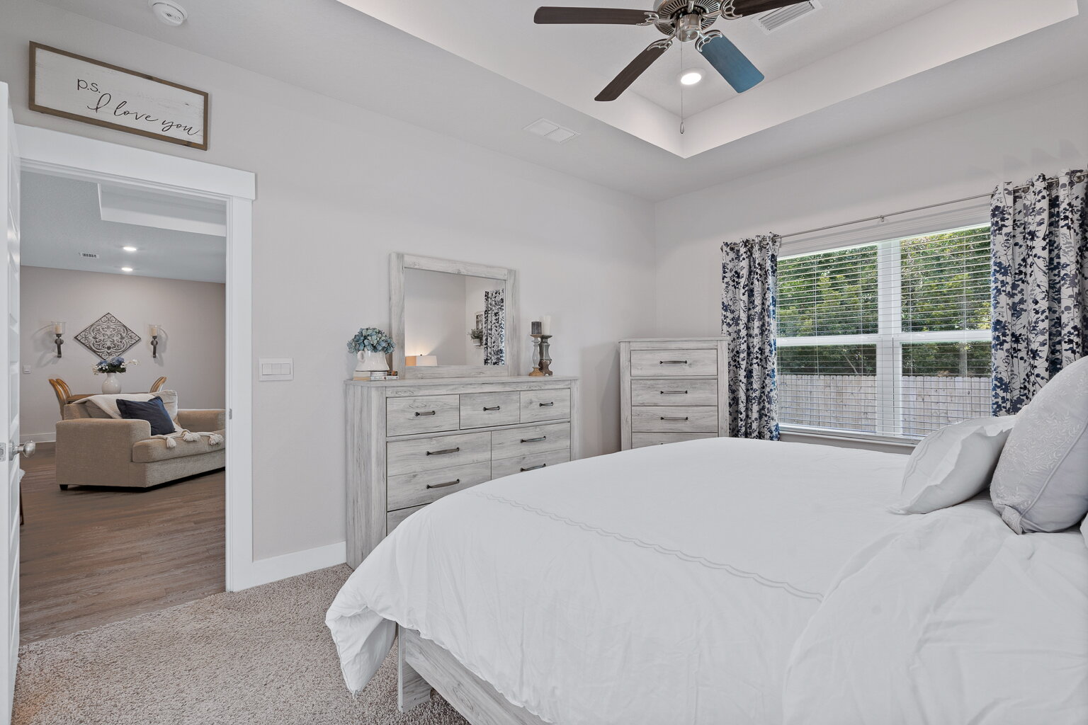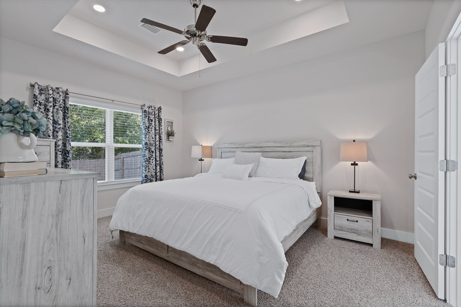 The primary bedroom is filled with natural light from large windows, creating an inviting, spacious retreat and a bath with a double sink vanity, shower, garden tub, and large closet. The second and third bedrooms are to the front of the home, split by the second full bath. The fourth bedroom is directly across from the second and third bedrooms.