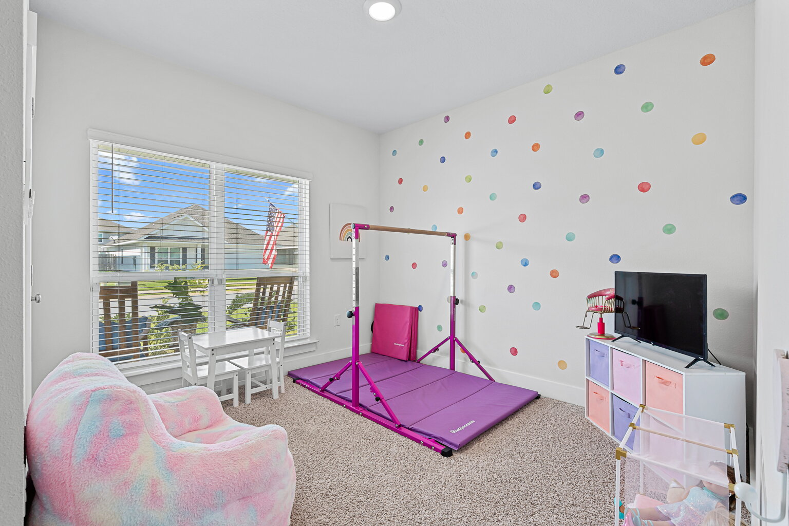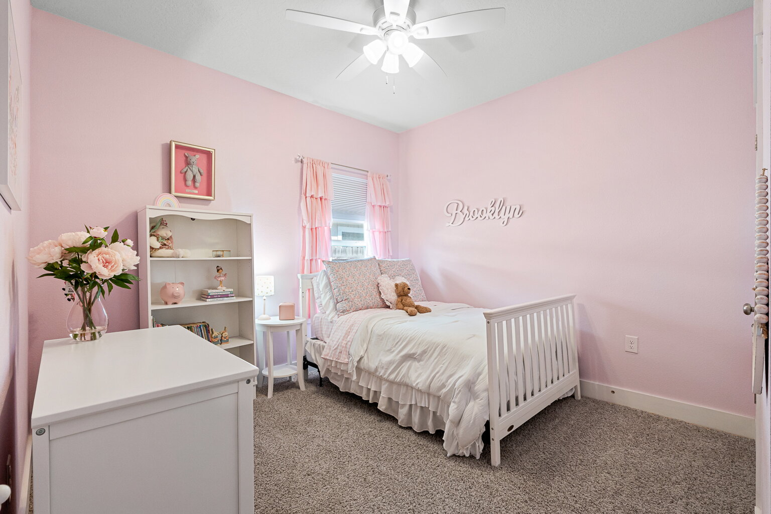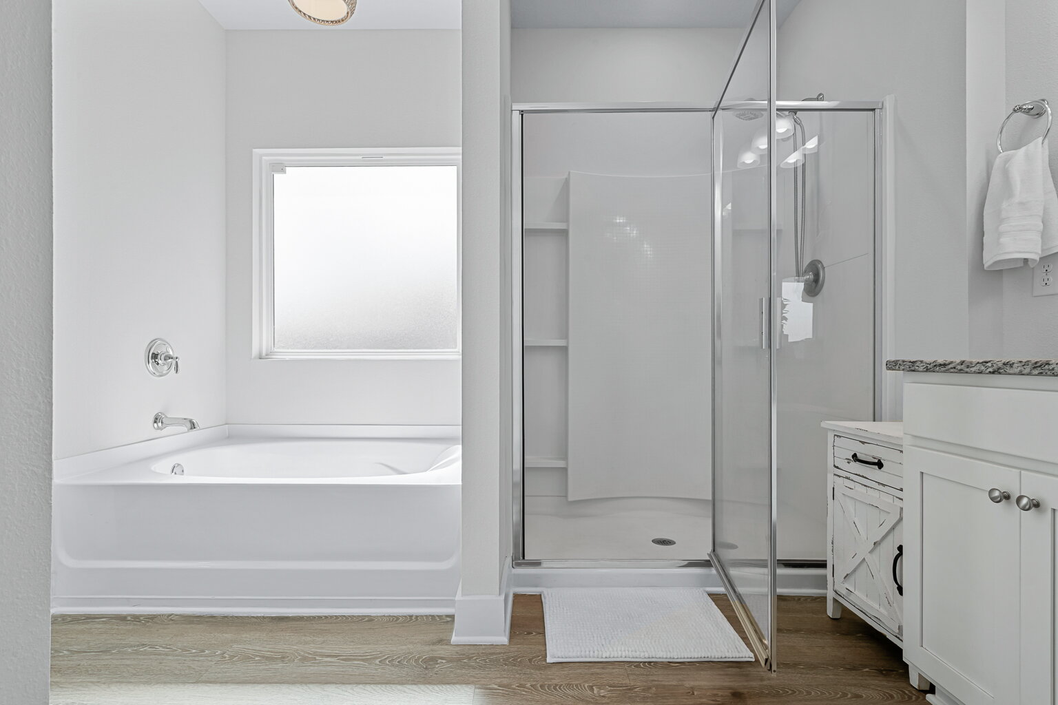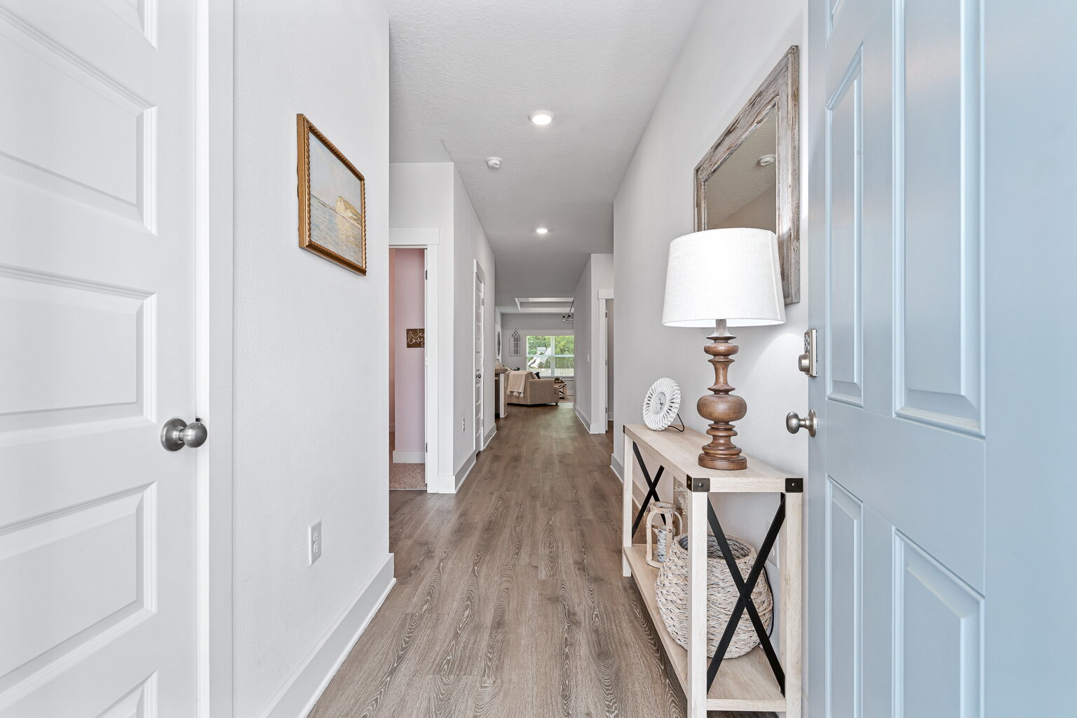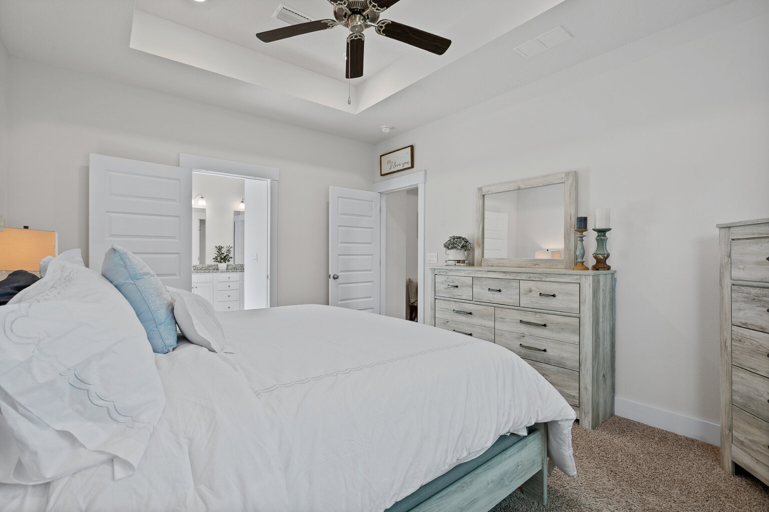 The primary bedroom is filled with natural light from large windows, creating an inviting, spacious retreat and a bath with a double sink vanity, shower, garden tub, and large closet. The second and third bedrooms are to the front of the home, split by the second full bath. The fourth bedroom is directly across from the second and third bedrooms.